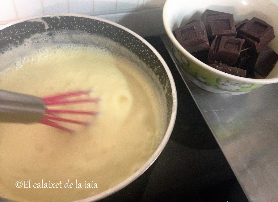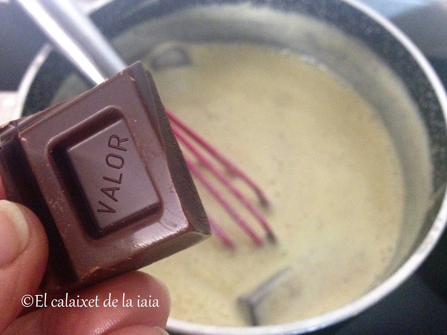 entonces retiramos el cazo del fuego, añadimos las onzas de chocolate, y seguimos removiendo hasta que se fundan completamente