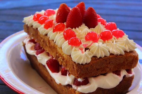 Assembling the cake: Cut the cake into two halves. If you have increased much you can cut the top to let those straight and dip them in chocolate milk plates. Cut some strawberries into small squares and the nicest leave to decorate the top. Spread the cream inthe bottom of the cake, a good coat. Cover with cut strawberries. If you fear that you get off at this point you can freeze a couple of hours and so will perfectly endure the top. Place the other half on top and cover well with a spatula or spoon, or manga, as you can and your means and imagination you leave, garnish with whole berries and some cherries, halved.