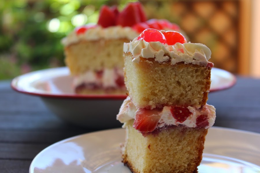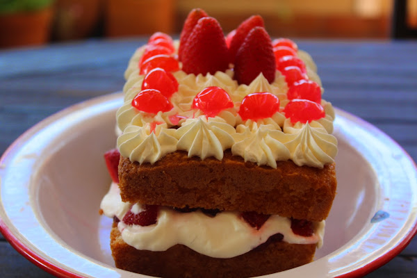 Extender la nata (crema de leche) enla parte de abajo del bizcocho, una buena capa. Cubrirla con las fresitas cortadas. Si tenéis miedo de que se os baje podéis en este punto congelarla un par de horas y así os aguantará perfectamente la parte de arriba.
