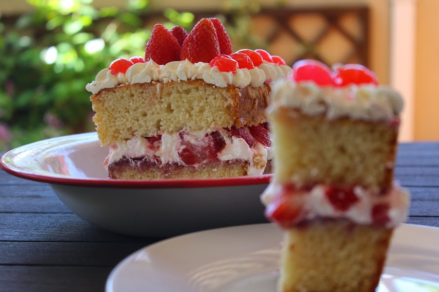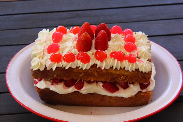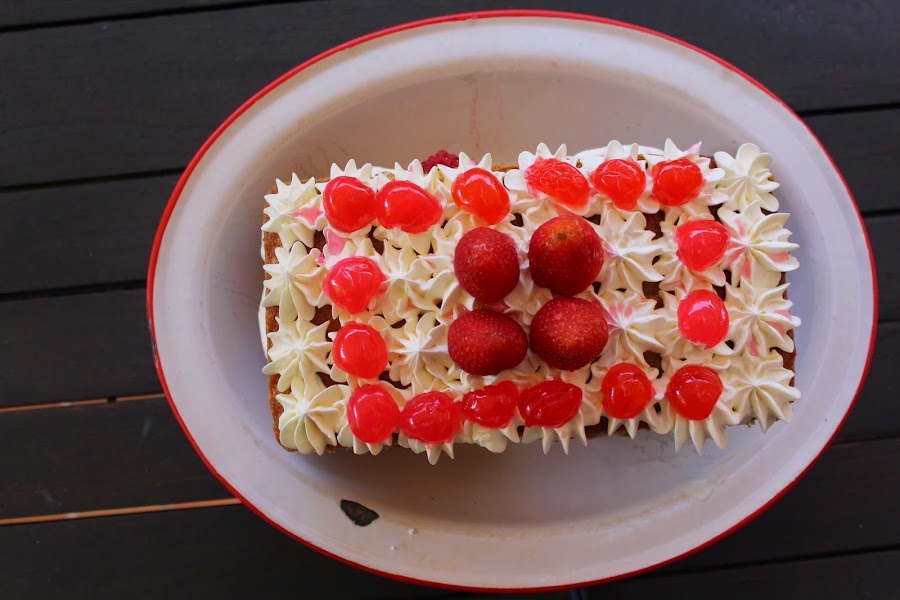 Colocar la otra mitad encima y cubrirla, bien con una espátula, o cuchara, o con manga, como podáis y vuestros medios e imaginación os dejen, Adornar con las fresas enteras y unas guindas partidas a la mitad.