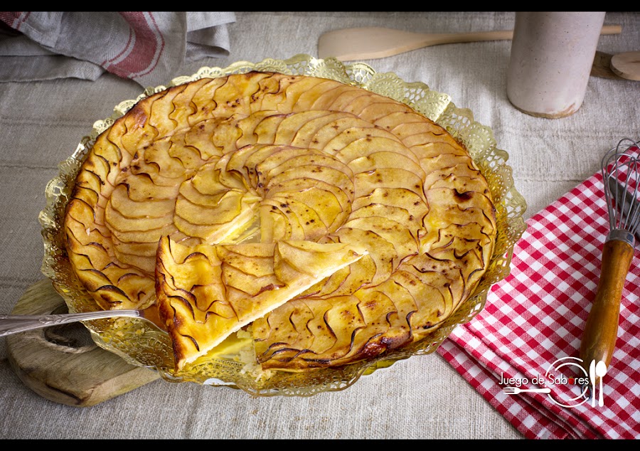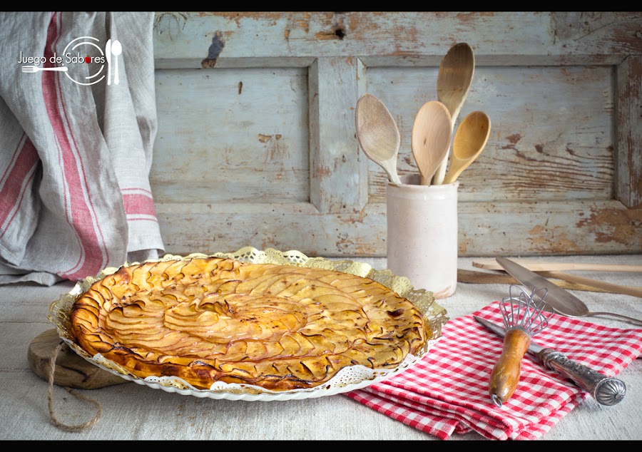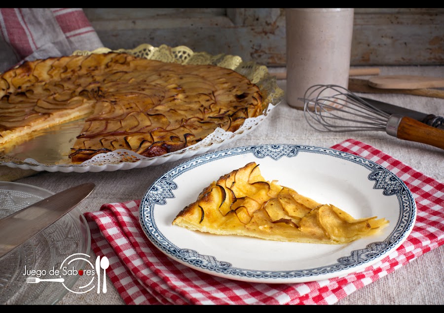 Tenemos ya una tarta de manzana en el blog. Es la que lleva el copyrigh de nuestra tía Sagrario, que ahora ya no cocina, pero a quién no queremos restarle méritos. Es la suya y así será “in saecula saeculorum”. Es lo justo. Esta otra tarta de manzana que hoy presentamos es superfácil y rápida de hacer. Queda muy fina. Se da un cierto aire a pizza, pero es un postre que entra muy bien y no empalaga pues lleva muy poca mantequilla y una fina capa de mermelada de albaricoque o de melocotón. Es apta para los no muy glotones.
