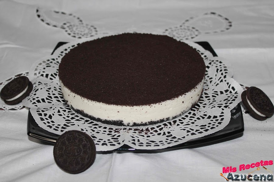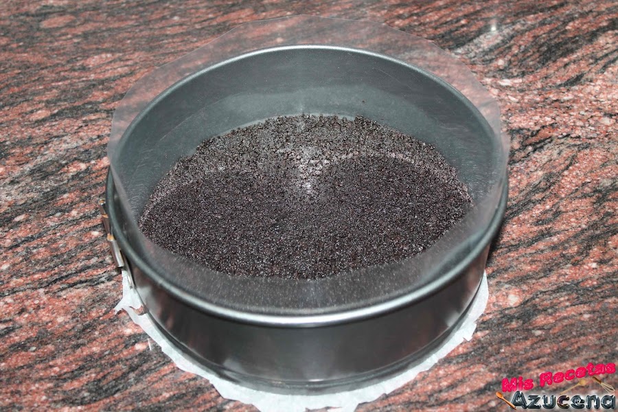 Sacamos nuestra tarta de la nevera y añadiremos nuestra galleta molida por encima, volvemos a dejar en la nevera hasta la hora del emplatado.