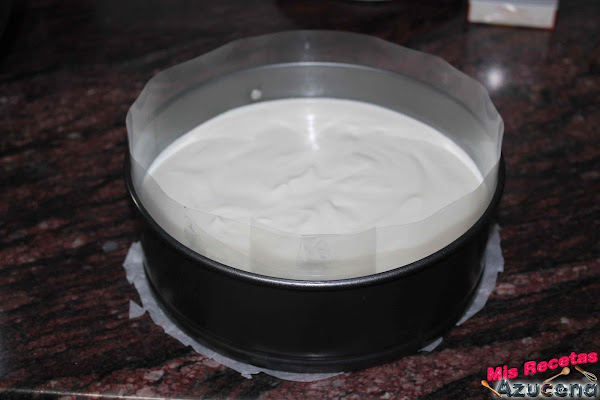 Sacamos el molde de la nevera y añadiremos el relleno, repartimos bien y lo volvemos a meter en la nevera y lo dejaremos entre 4 y 5 horas.