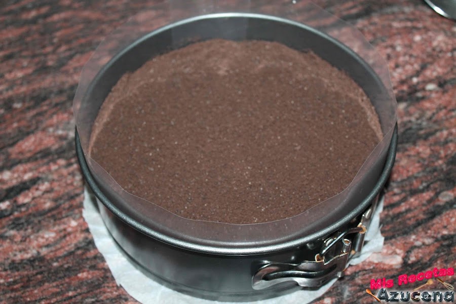 Ahora cogemos nuestro molde y ponemos la mezcla que acabamos de preparar, repartimos bien sobre toda la base y la aplastamos con ayuda de una cuchara, seguidamente metemos el molde en la nevera.