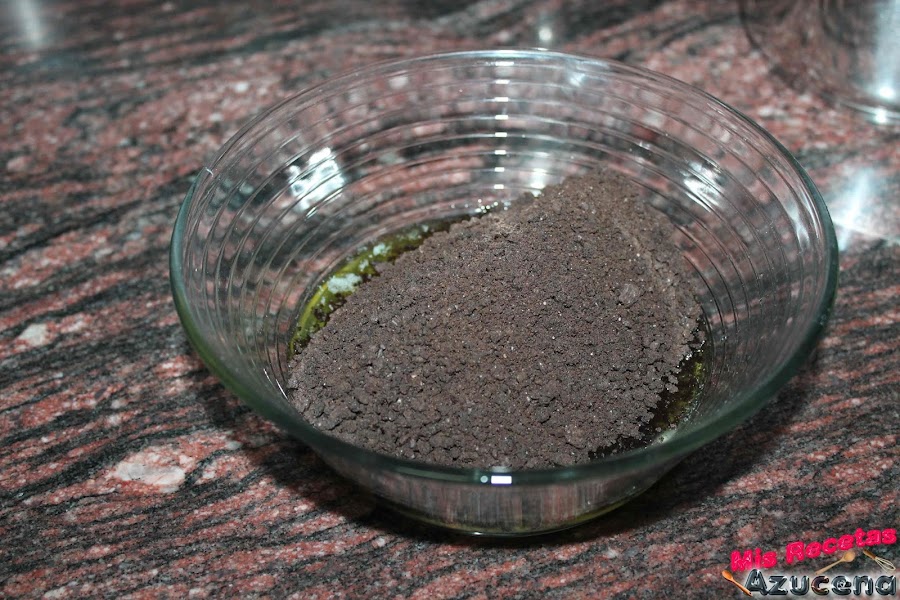 Transcurrido el tiempo comprobaremos que la tarta este consistente entonces cogeremos las galletas que teníamos reservadas para la cobertura, las ponemos en la picadora y las moleremos bien hasta formar como una harina.