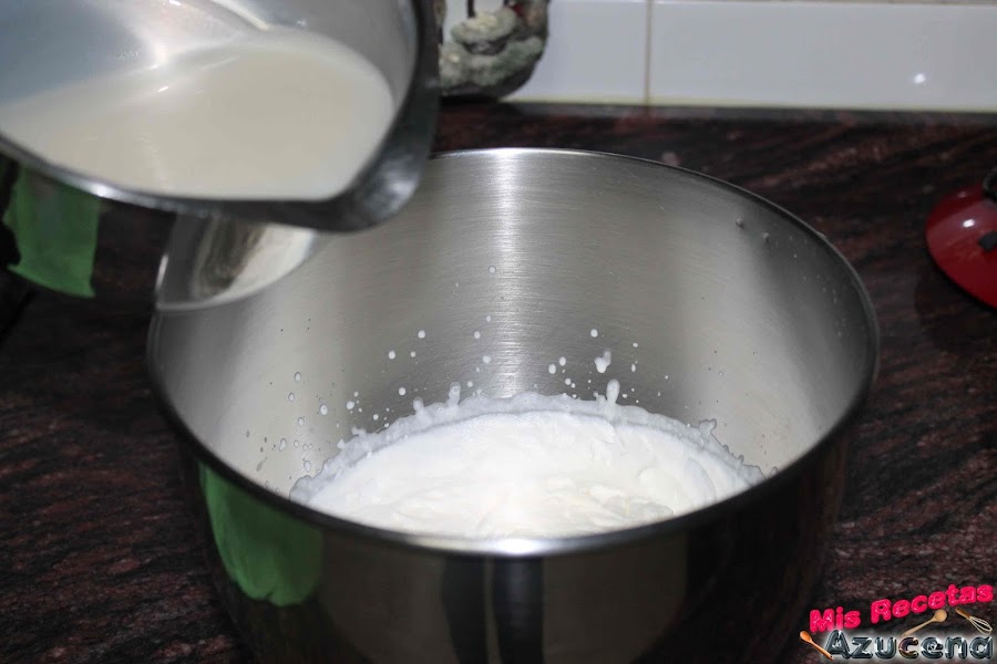 Mientras cogeremos un bol donde pondremos la nata (crema de leche) y con ayuda de unas varillas eléctricas o con varillas a mano montaremos la nata (crema de leche) a punto de nieve.