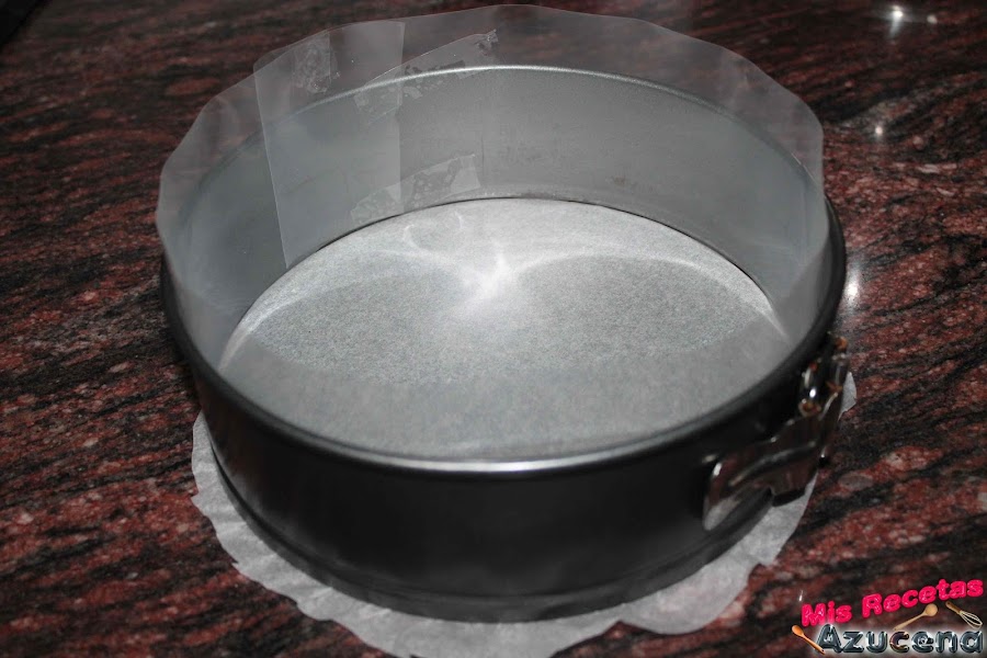 Lo primero que haremos será preparar nuestro molde, yo para este receta he utilizado un molde de 20 centímetros de diámetro, en la base le he puesto papel vegetal y por los lados lo cubriremos con una laminas acetato.