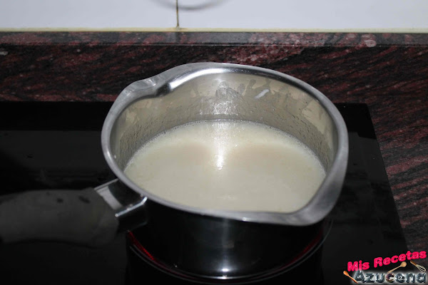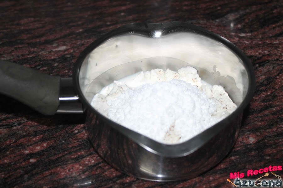 Ponemos un cazo al fuego con la leche y la crema de las galletas que teníamos reservadas, también añadiremos el azúcar glass, lo dejaremos a fuego medio hasta que la crema de las galletas se funda con la leche y el azúcar, con ayuda de unas varillas pequeñas iremos removiendo para ayudar a fundir.
