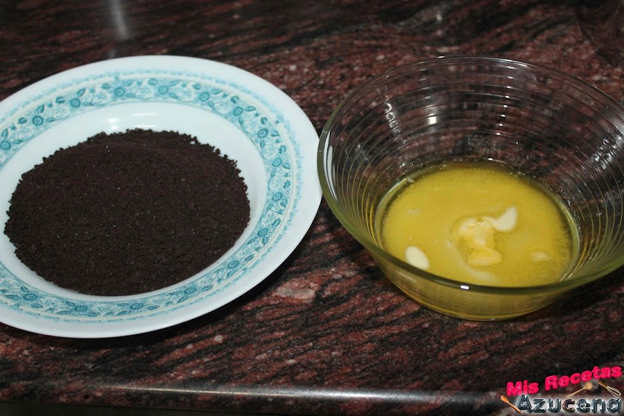 Cogemos 110gr de las galletas y las ponemos en la picadora, y las picaremos hasta que se deshagan por completo. La mantequilla la ponemos en un cuenco y la fundiremos metiéndola en el microondas, le daremos intervalos de segundos hasta que se nos derrita bien.