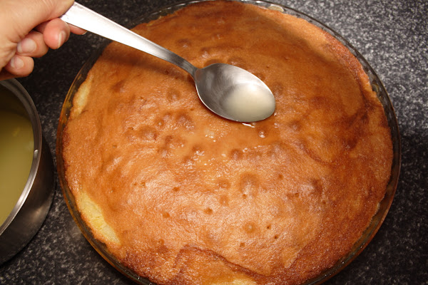 Con ese palo de la brocheta la pinchamos por toda la tarta y con ayuda de una cuchara, vamos vertiendo el jugo y el ron, despacio, que lo chupe bien. Reservamos 1/4 del jugo para terminar de empaparla cuando se enfríe.