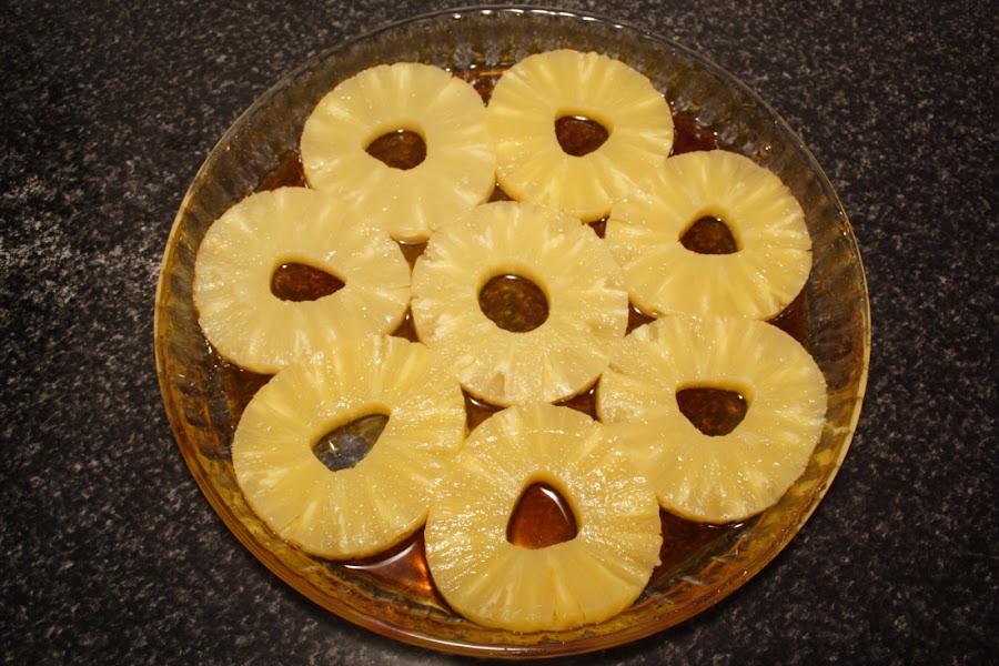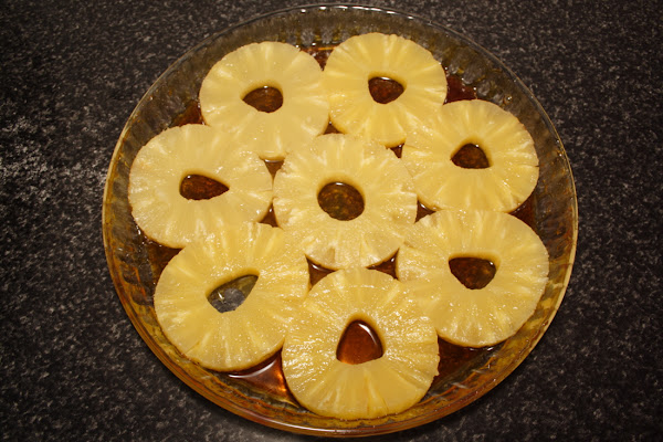 Untamos muy bien el molde con el caramelo líquido, con la ayuda de una brocha, de forma que untemos también los bordes. Disponemos sobre el caramelo las rodajas de piña (que serán unas 8) y reservamos.