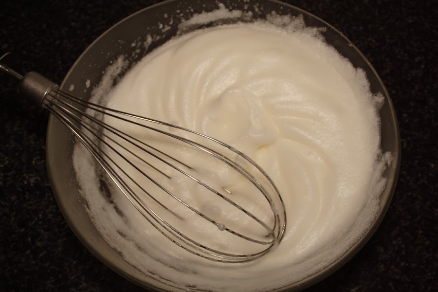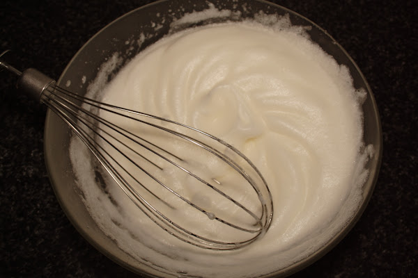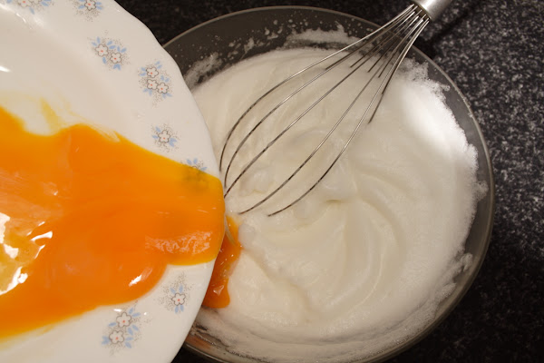 Separamos las claras de las yemas y en un bol grande montamos las claras, con una pizca de sal, con la ayuda de la varilla de la batidora. Cuando estén bien montadas y consistentes añadimos las yemas y seguimos batiendo hasta que quede una crema homogénea. Reservamos.