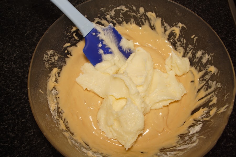 Vamos echando, poco a poco, la harina en la crema de las yemas y las claras, batimos hasta que se integre todo y aquí verteremos la crema de la mantequilla y el azúcar. Mezclamos muy bien con una espátula, con movimientos envolventes, quedará una masa espesa, pero importa, se extiende bien.
