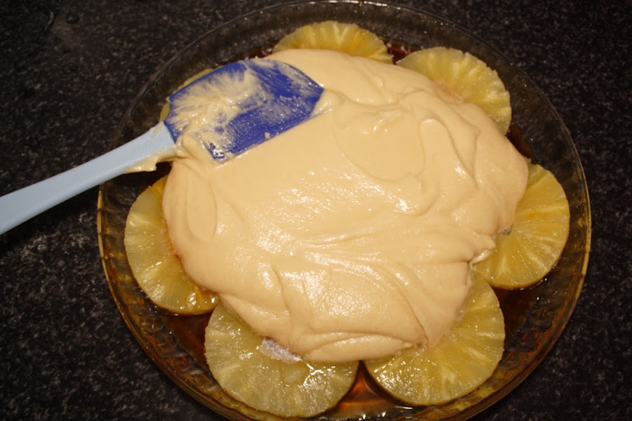 Y todo ello lo echamos en el molde, sobre la piña. Extendemos bien con ayuda de una lengua de cocina, que quede todo plano. Metemos en el horno a 170ºC, calor arriba y abajo, durante 30 minutos.