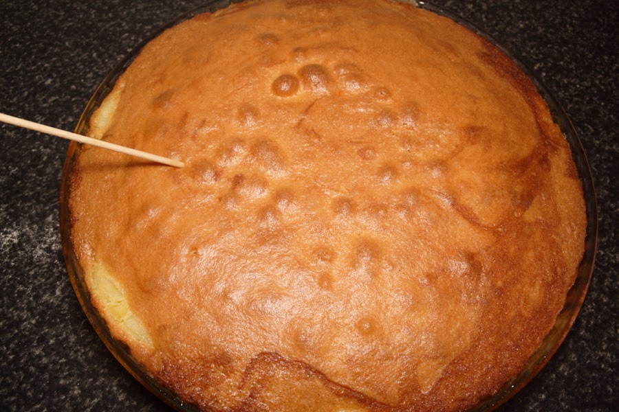 Cuando la tarta esté horneada, la sacamos y con el palo de una brocheta la pinchamos para ver si esta hecha, si el palo sale limpio, nuestra tarta esta perfecta.