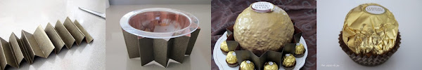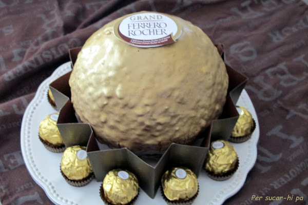 Queda la decoración final. Elegir una cartulina que de un efecto parecido a la cápsula de los bombones originales, como por ejemplo ésta de un marrón metalizado. Cortar una tira rectangular, según la medida del "ferrero", y hacerle los pliegues . Colocarla alrededor de la tarta. La etiqueta superior está recuperada de la caja original.