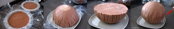 Previamente habremos preparado los moldes. Nosotros hemos utilizado dos semiesferas de material plástico (metacrilato) que hemos forrado con papel film. Puede utilizarse cualquier otro tipo de molde que nos aproxime un resultado esférico, por ejemplo un par de boles del mismo tamaño.