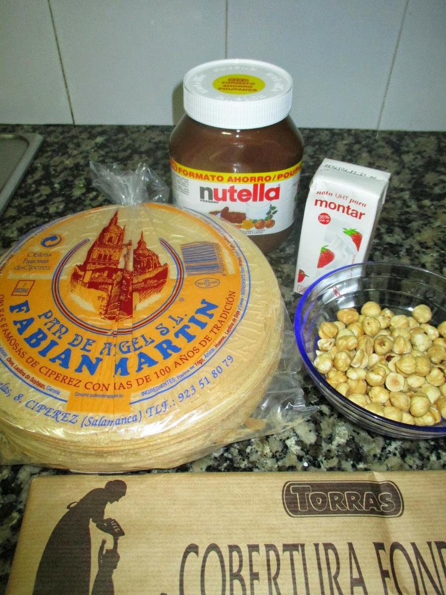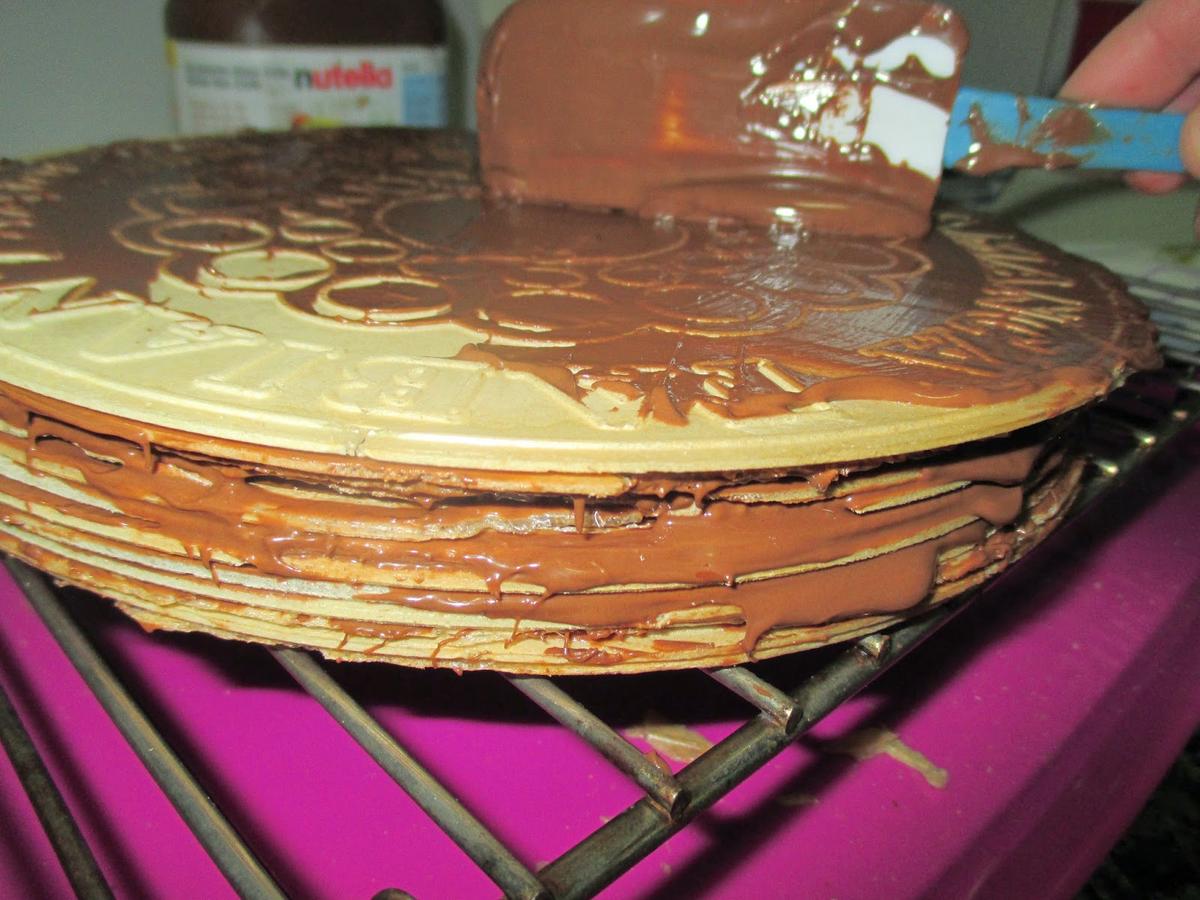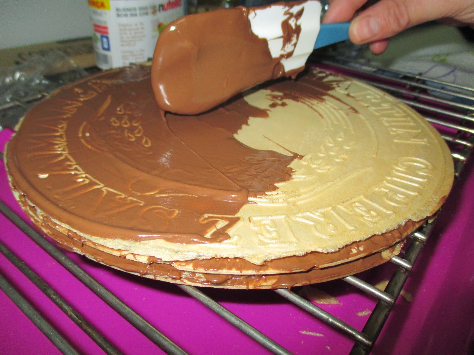 Untar las obleas con Nutella e ir poniendo capas dependiendo de lo alto que se quiera la tarta, tener paciencia sobre todo con la primera oblea para que no se rompa, luego según vas poniendo capas la tarta se hace más consistente.
