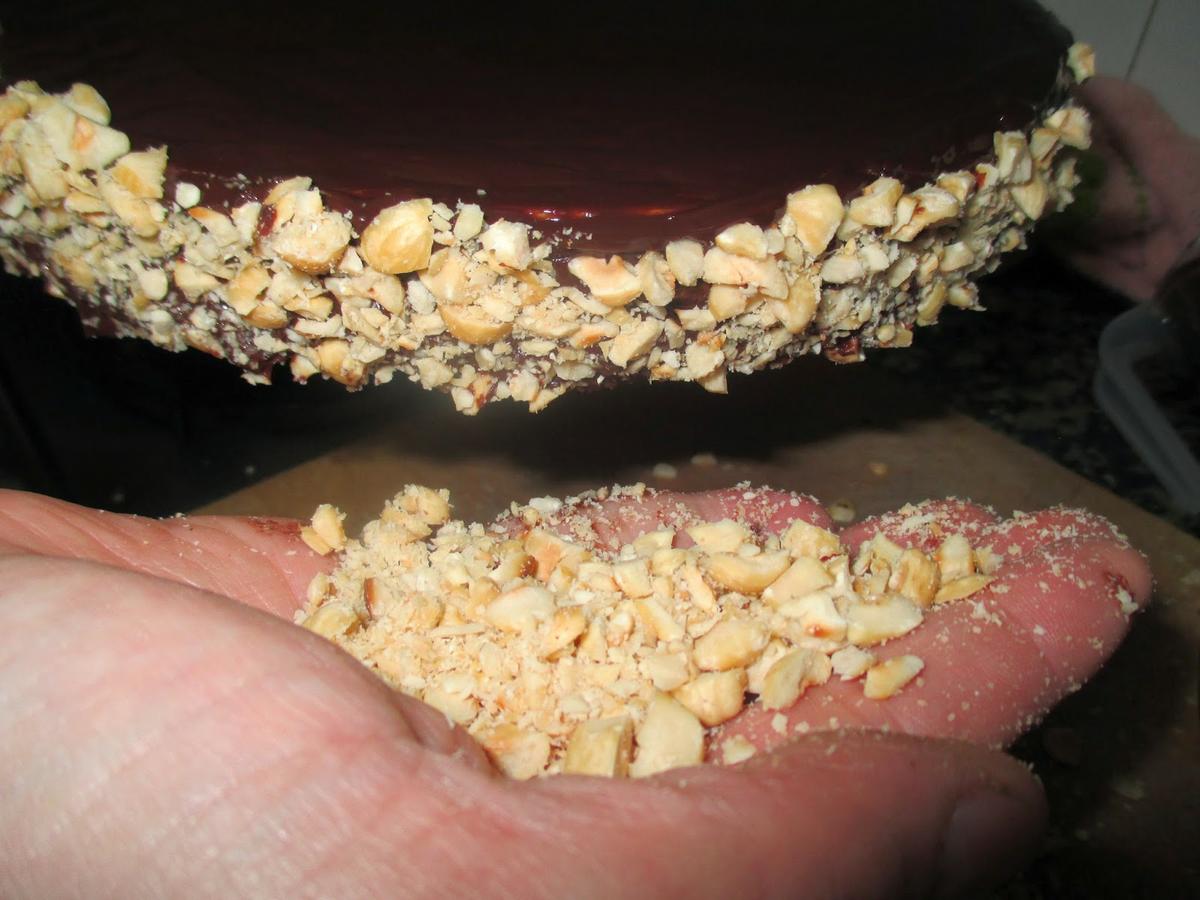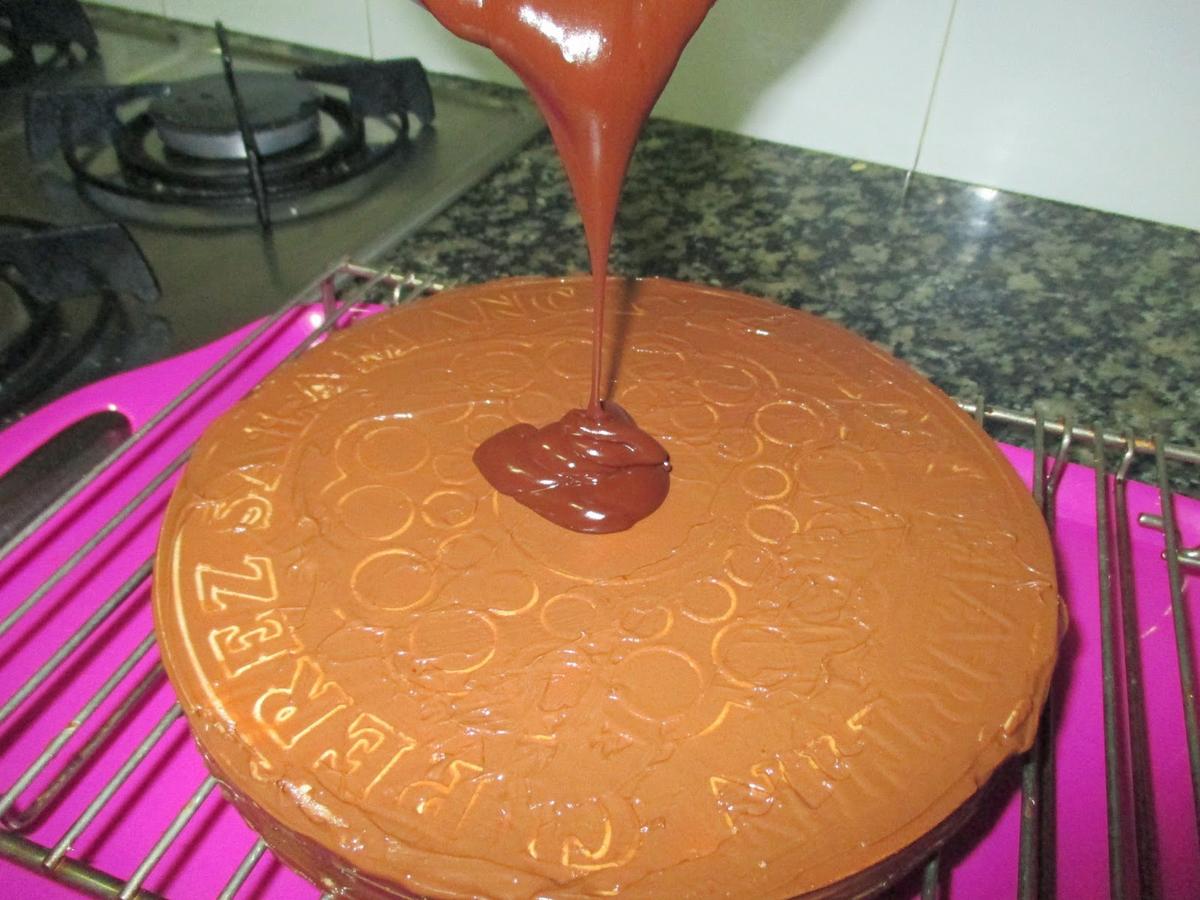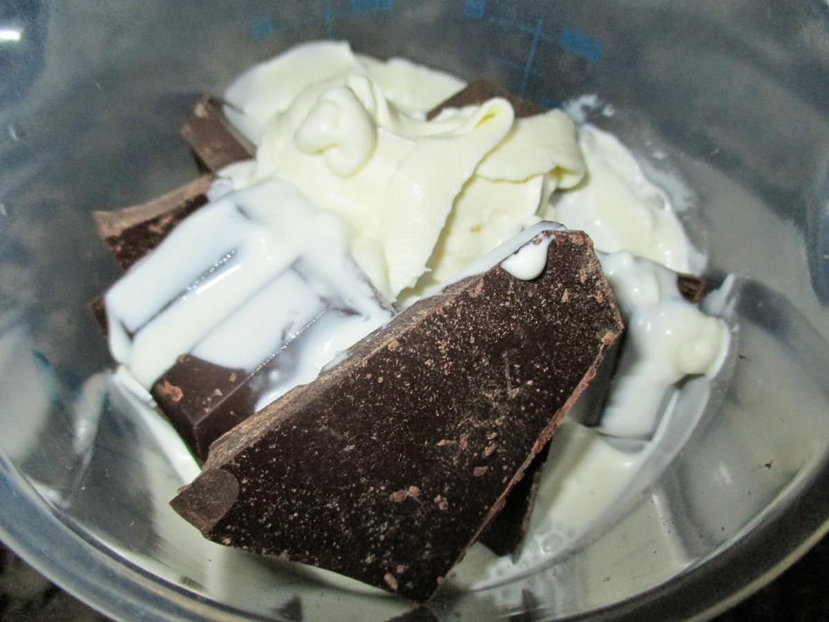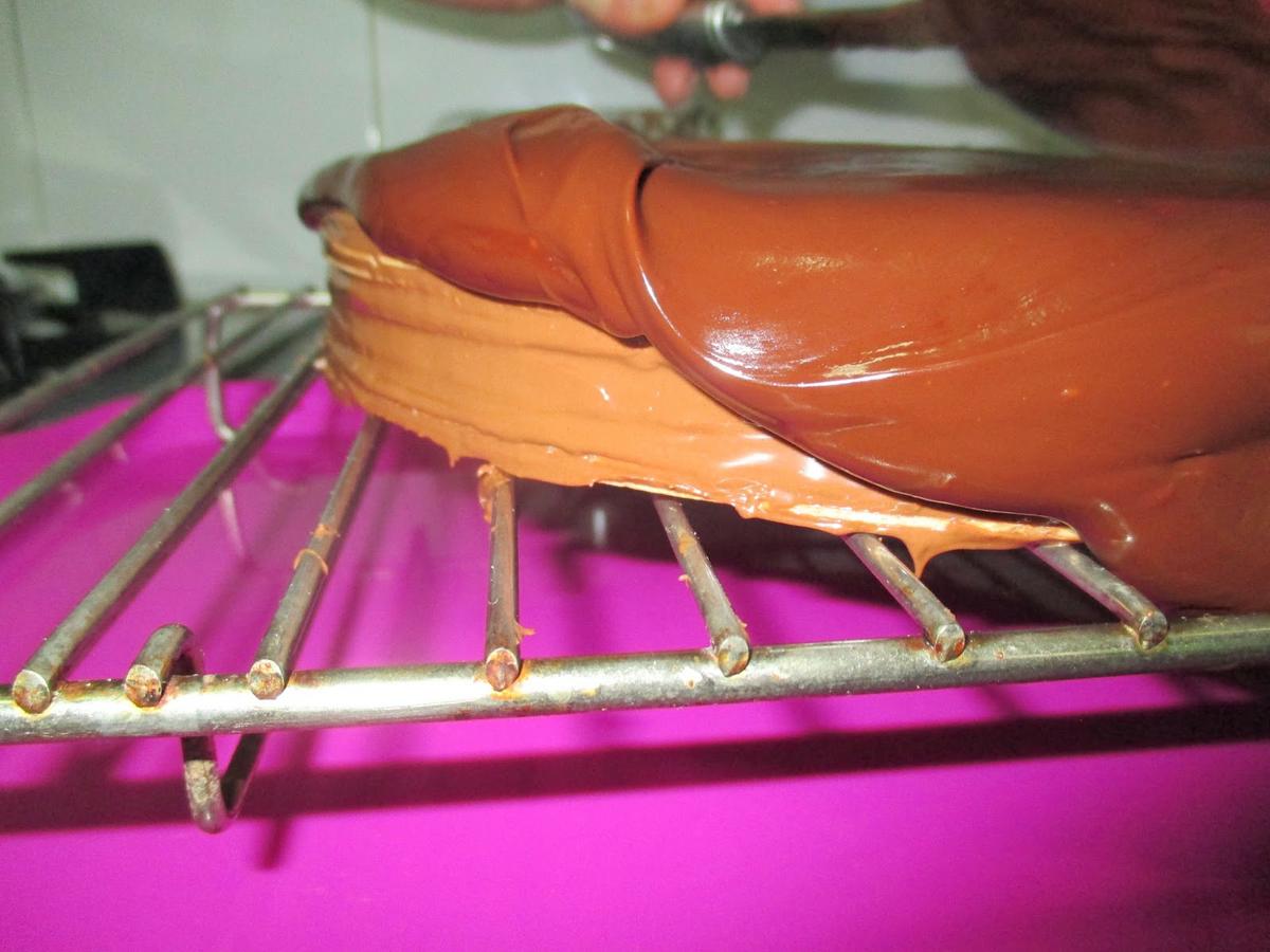 Calentamos la nata (crema de leche) y el chocolate con cuidado de que no se nos queme, hasta que el chocolate se disuelva totalmente y volcar sobre la tarta para cubrirla.