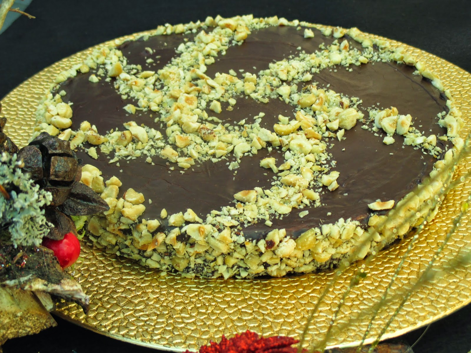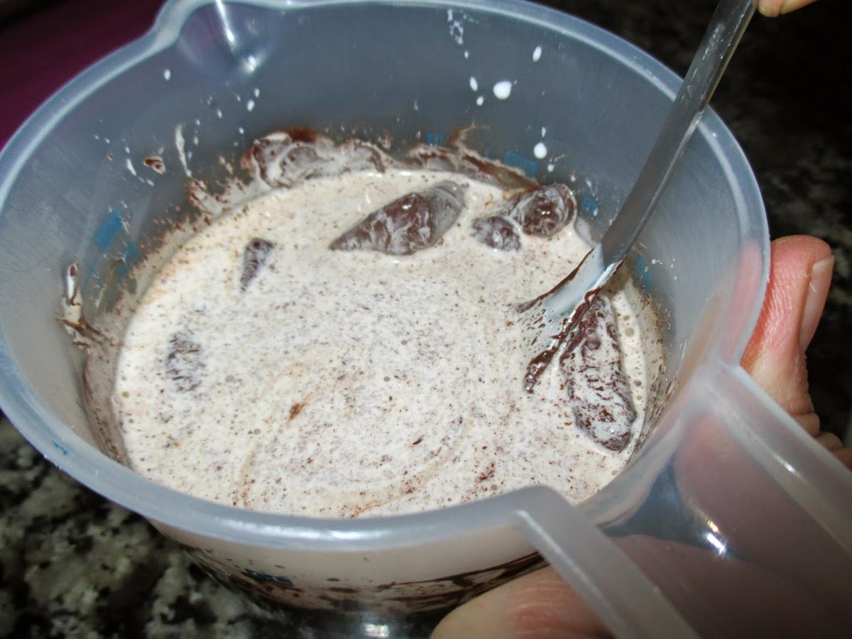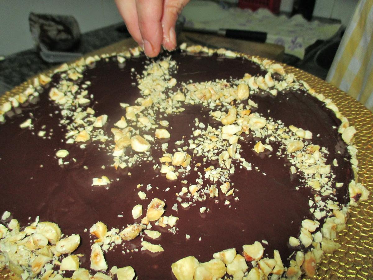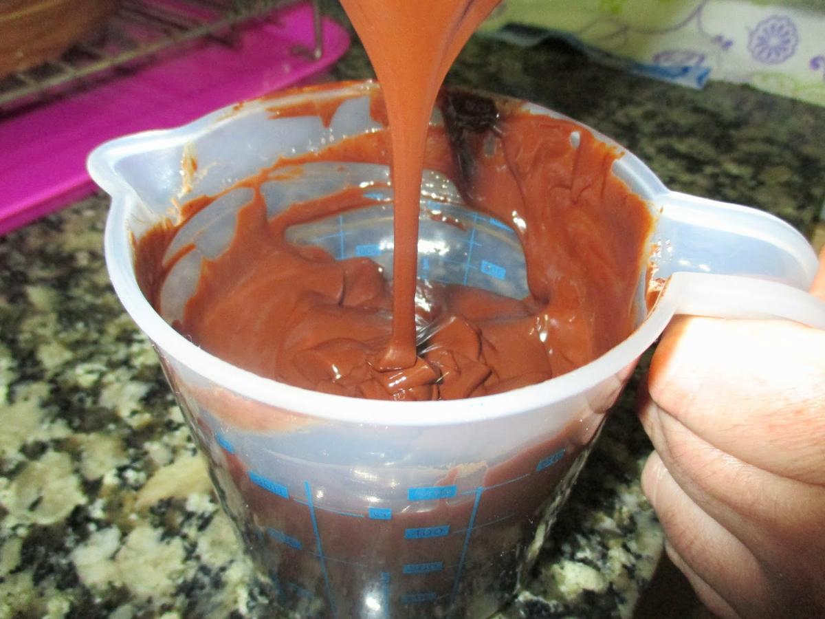 Calentamos la nata (crema de leche) y el chocolate con cuidado de que no se nos queme, hasta que el chocolate se disuelva totalmente y volcar sobre la tarta para cubrirla.