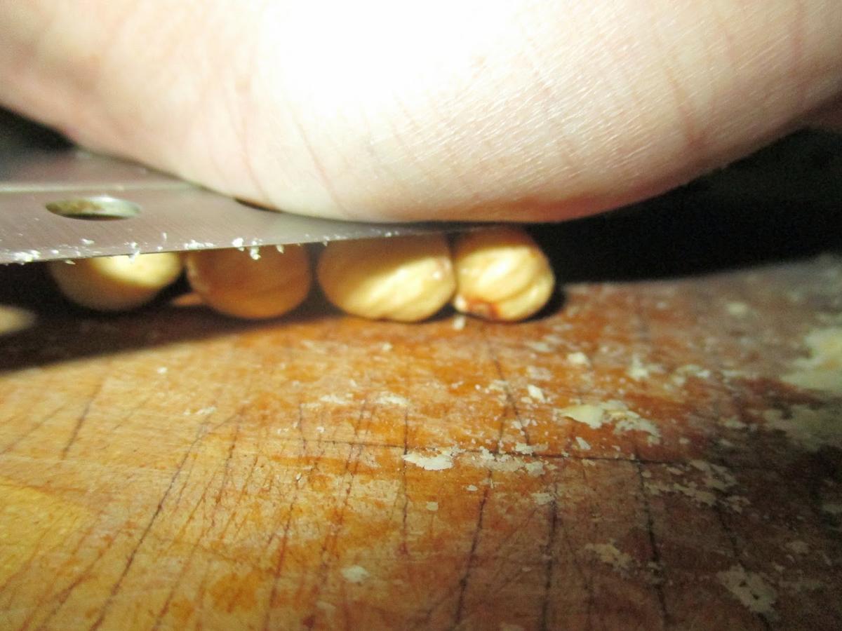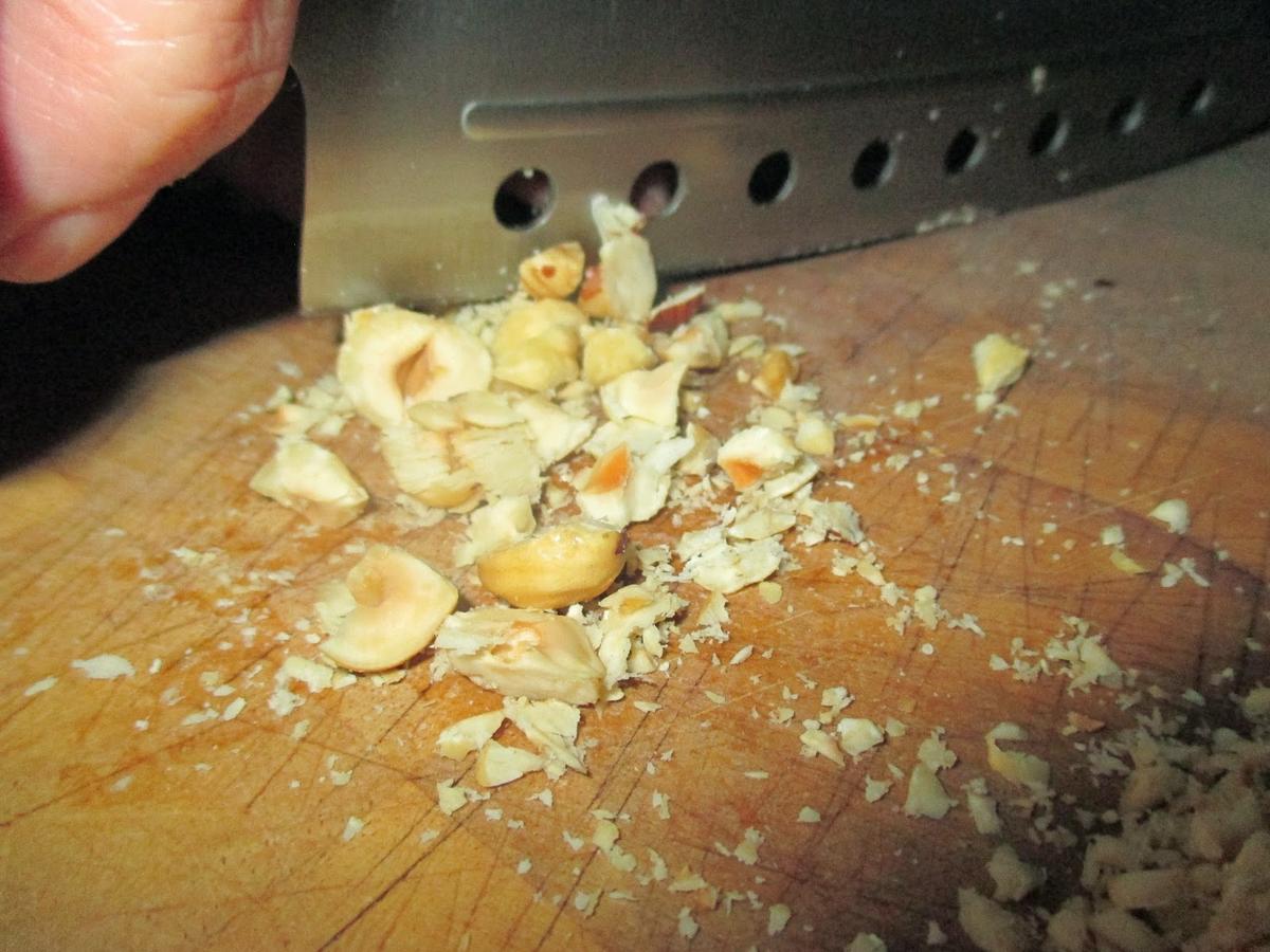 Partimos las avellanas con la parte plana del cuchillo y las picamos a nuestro gusto.