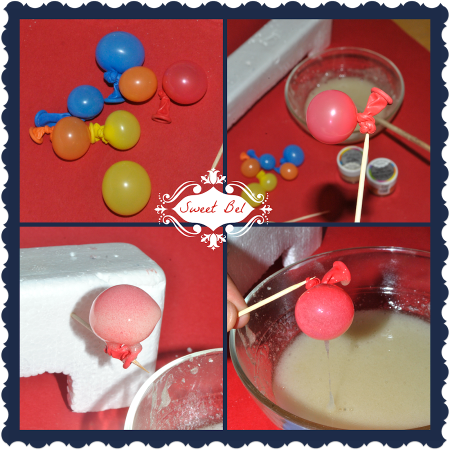 Ya tenemos la gelatina preparada, ahora cogemos los globos y en el nudo le clavamos un palillo, así no nos mancharemos y es una manera de que se sequen sin abolladuras.