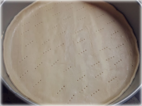 Engrasamos el molde con un poquito de mantequilla y colocamos el hojaldre, pinchándole toda la superficie con un tenedor (para que no suba cuando horneemos)