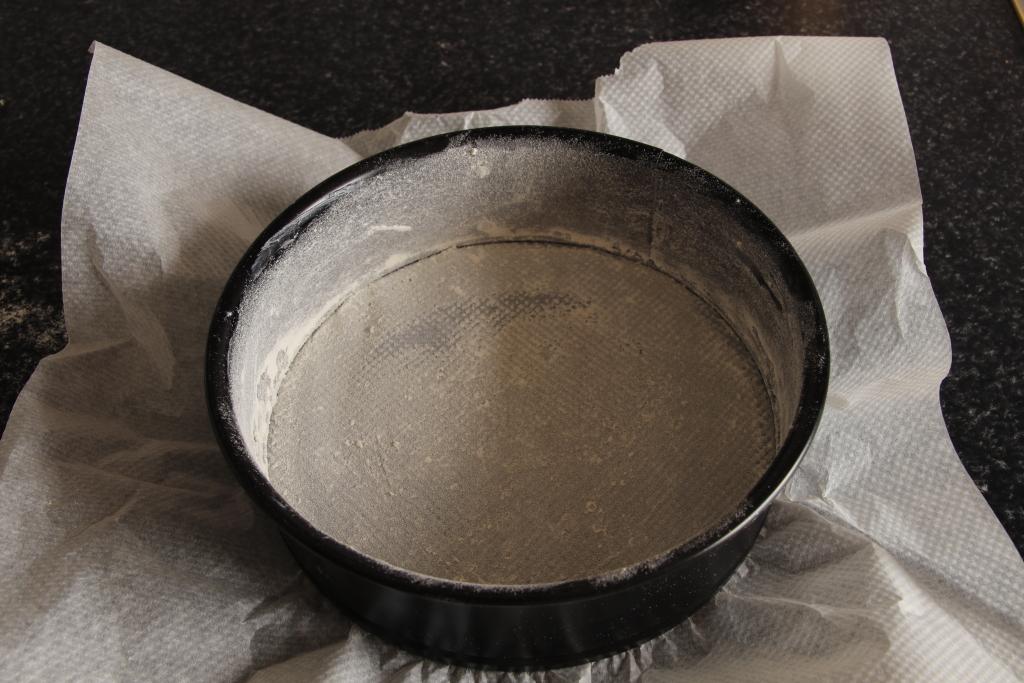 Escogemos un molde desmoldable, en ésta ocasión he elegido uno redondo de 20 x 6 cm. Forramos el fondo con papel de hornear, untamos con mantequilla y espolvoreamos con harina, retiramos el sobrante y reservamos.