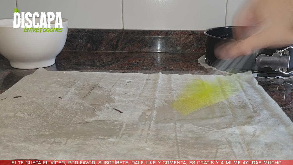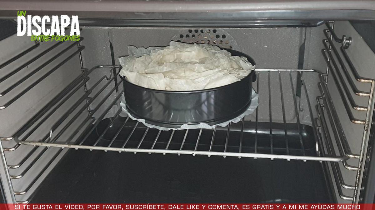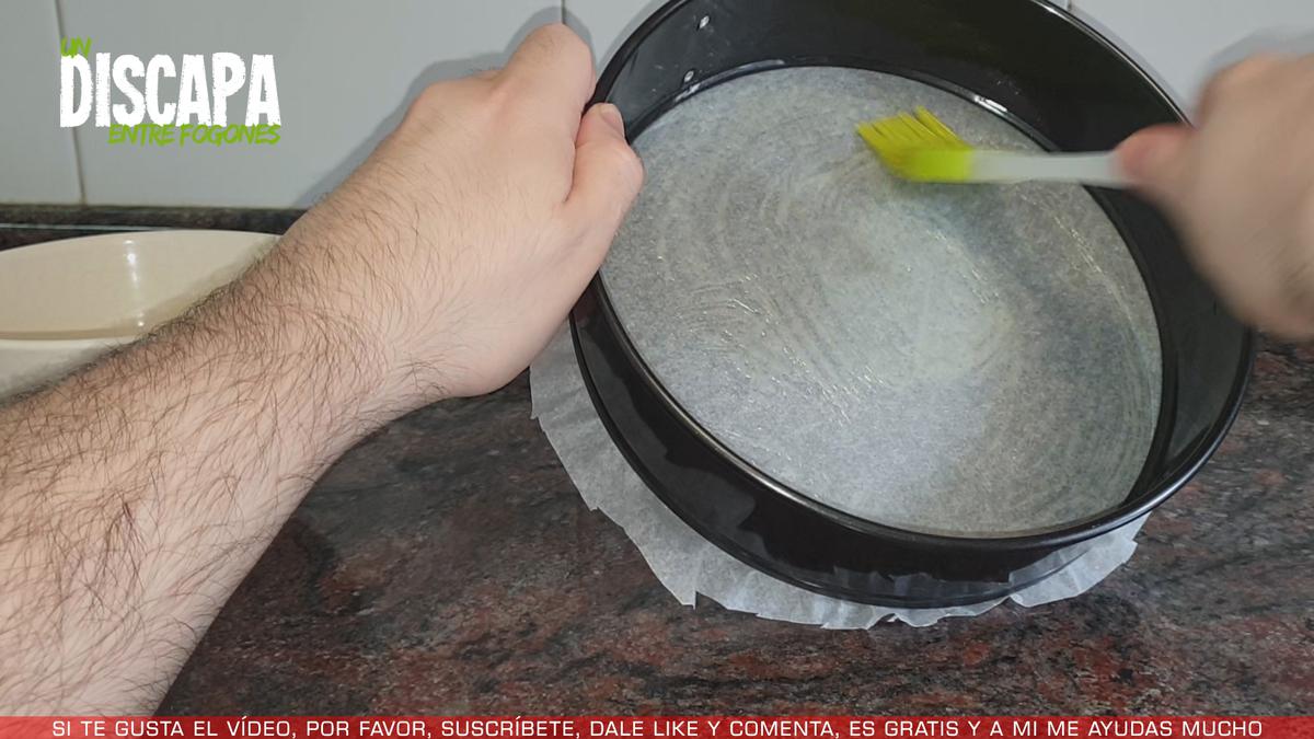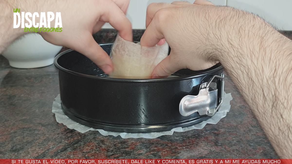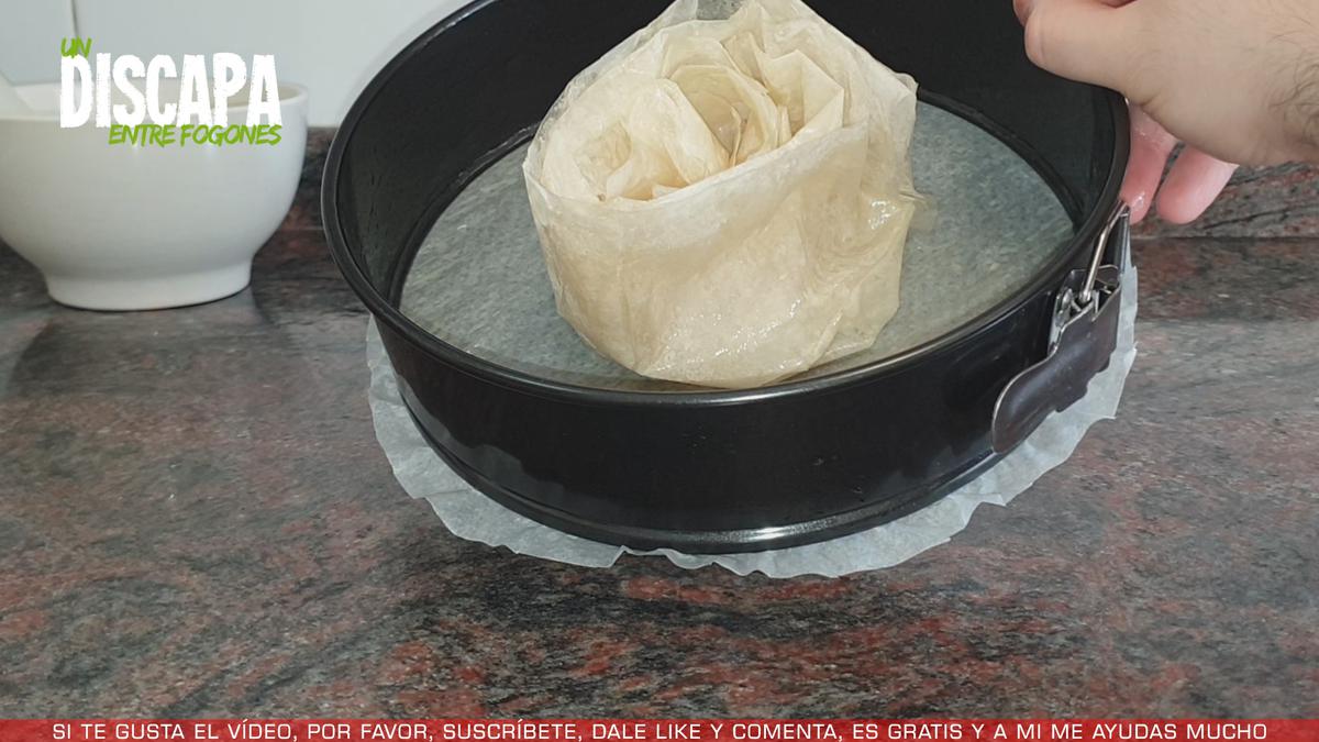 2Y aquí tengo un molde de unos 22 centímetros de diámetro y unos 6 centímetros de alto al que le e puesto papel de horno en la base.