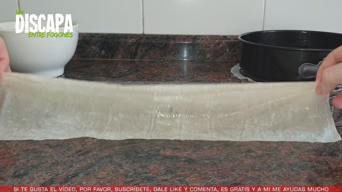 Repetiremos la misma operación hasta terminar con toda la masa filo. Para un molde de estas dimensiones lo normal será utilizar unas 10 o 12 hojas de masa filo.