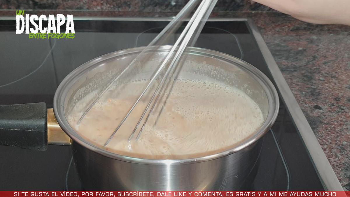 9Después, añadimos 4 huevos a un recipiente amplio, los batimos, y añadimos la mezcla de la leche, el azúcar y el turrón y lo mezclamos bien.