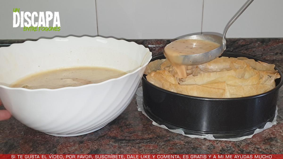 10Ahora sacamos la masa filo del horno y le vamos añadiendo poco a poco la mezcla líquida, procurando que quede lo más repartida posible.