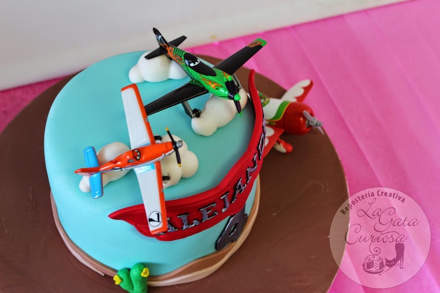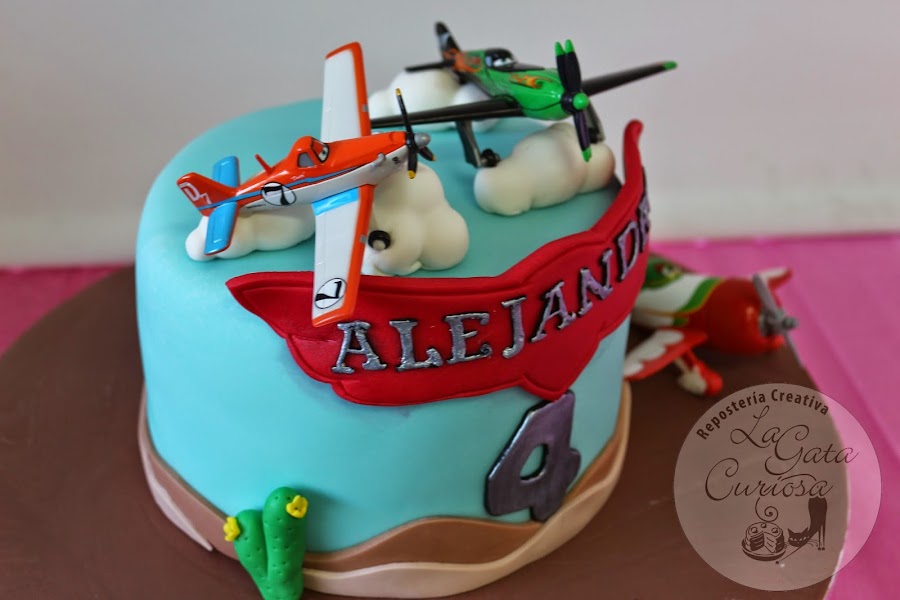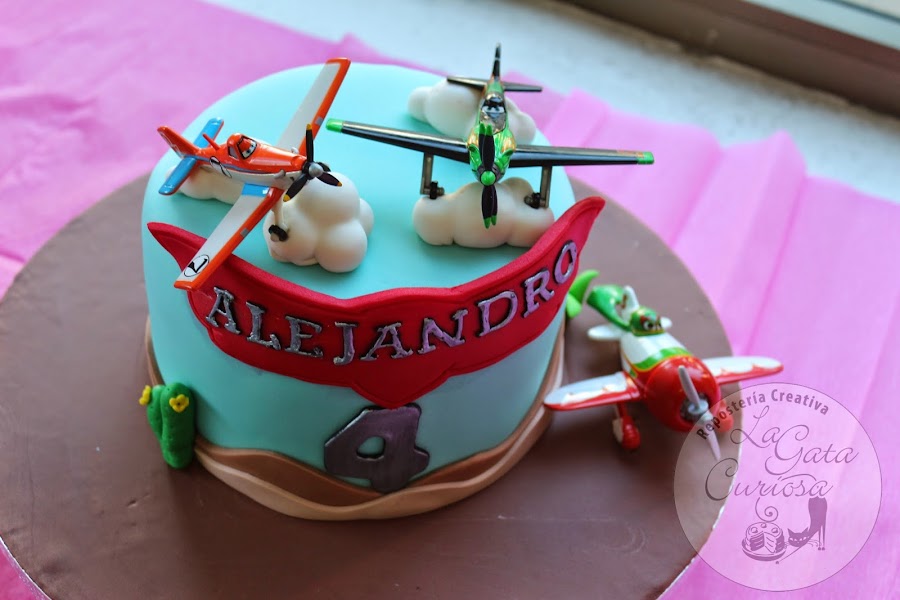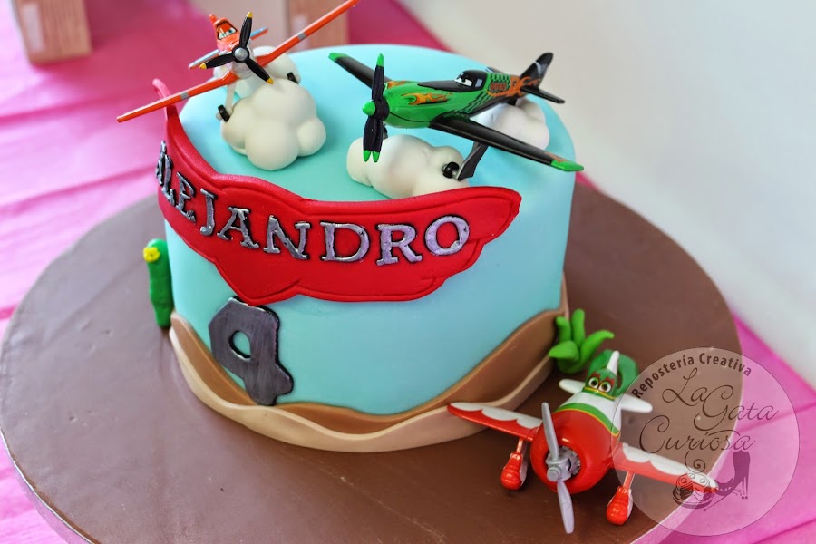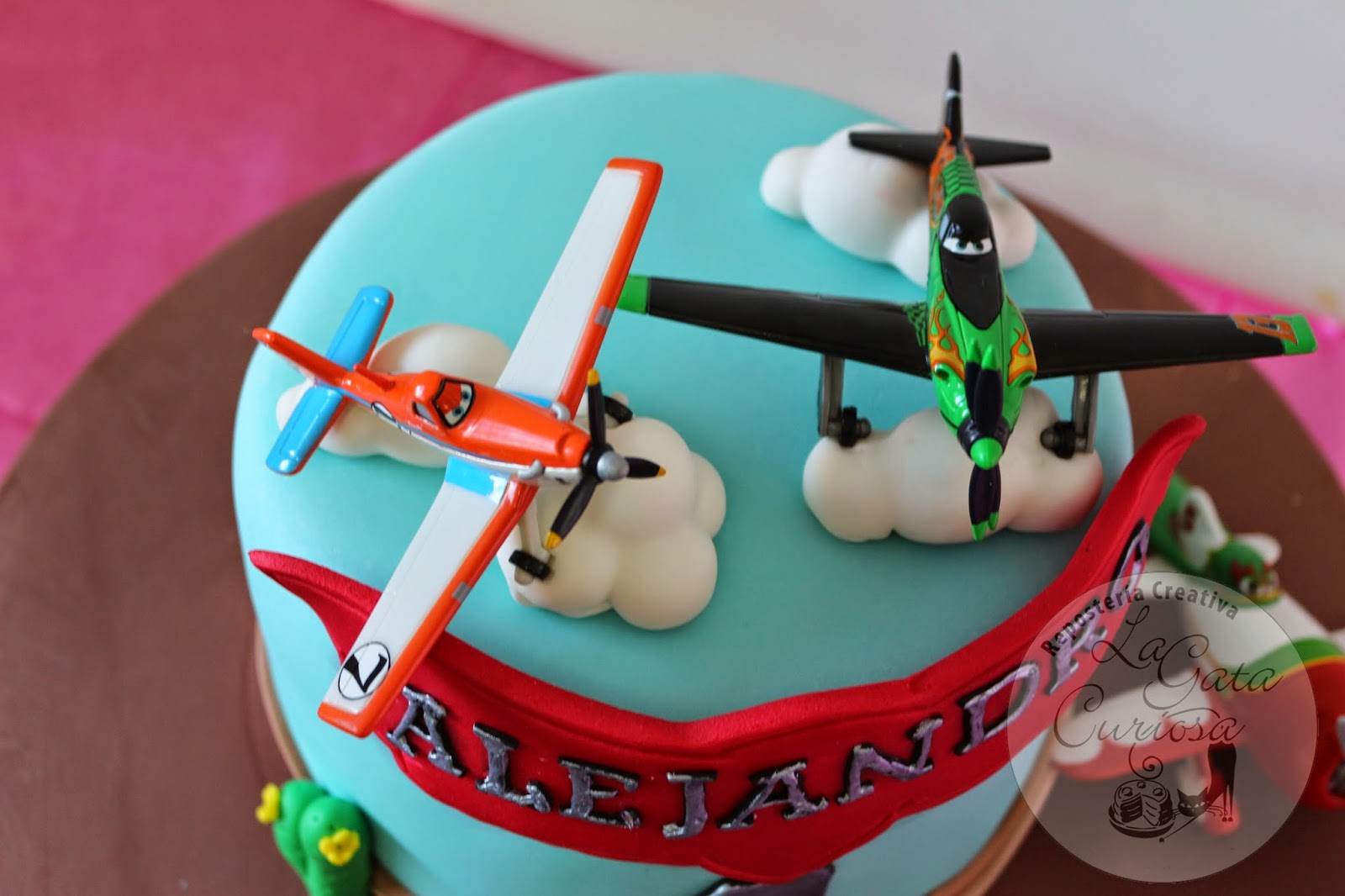Para la tarta hemos usado aviones de juguete en vez de figuras modeladas, quería todos los personajes y además nosotras andábamos muy liadas,