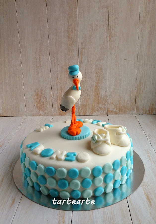 Me pidieron que fuera azul y blanca, que tuviese unos patucos, una cigüeña, su nombre y los circulitos rodeando la tarta(se parece esta tarta que hice, que fue la que les gusto).