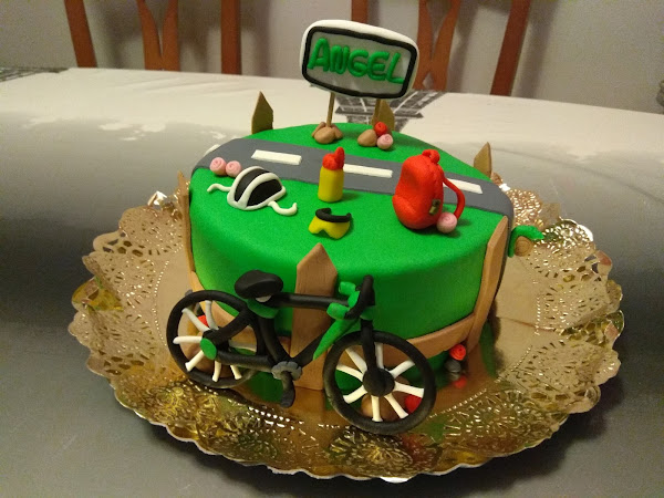 Y después de el bizcocho y el relleno comienza la decoración.... bueno como veis es sencilla, una carretera, un campo y cosas de ciclista. Lo mas complicado que fue de hacer fue la bicicleta. Tuve que dejarla secar bastante tiempo para poder ponerla en pie y también tuve que ponerle un poco de estructura por dentro para reforzarla. Puse un trocito de palillo y un pequeño alambre del que se usa para hacer las flores. Bueno después del trabajo minucioso no resulto tan malo el final.