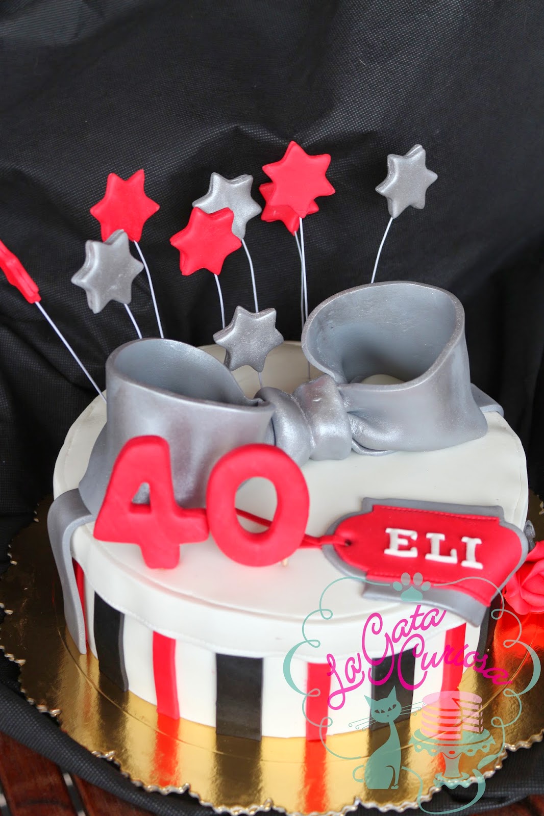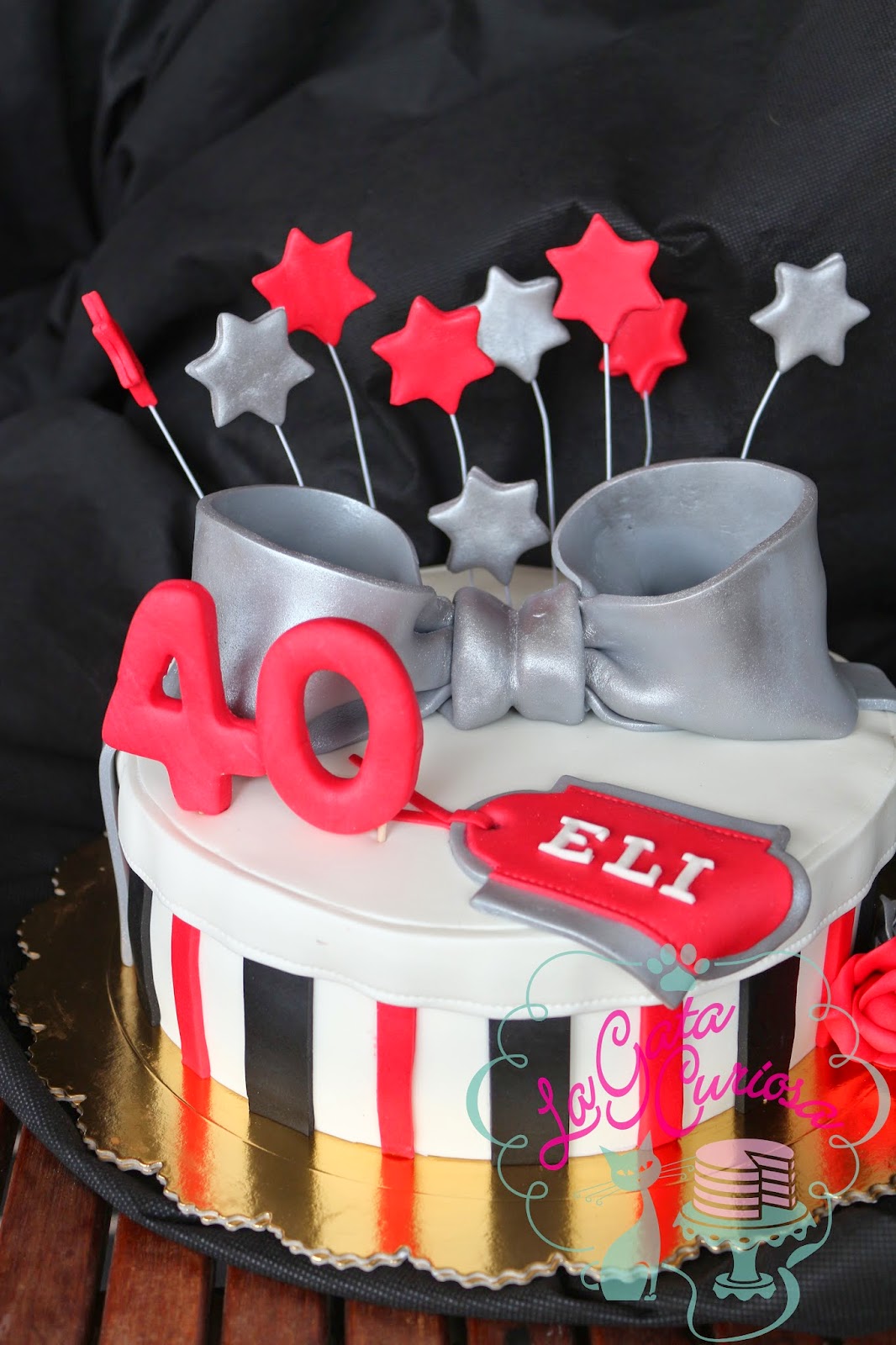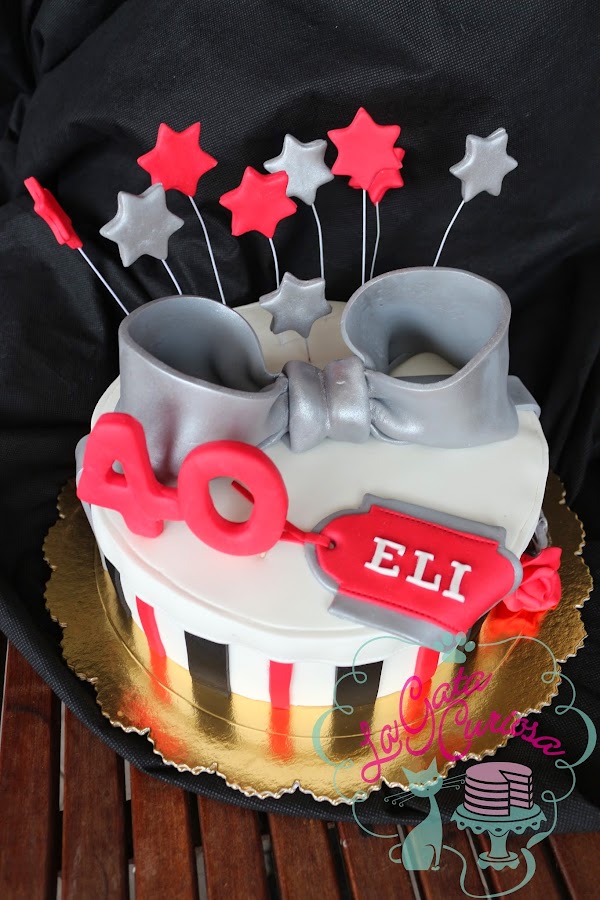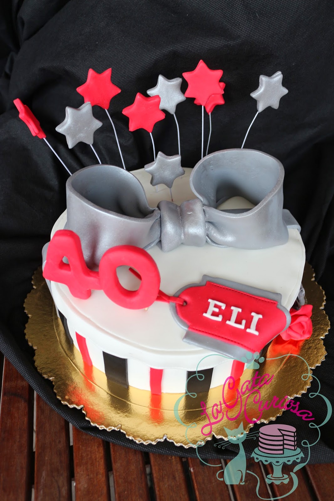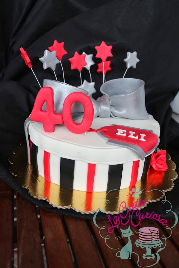 Elisa cumplió 40 años el sábado pasado y sus amigas nos encargaron una tarta con forma de regalo para celebrarlo, los colores elegidos fueron el blanco, el negro y el rojo, complementados con plateado.
