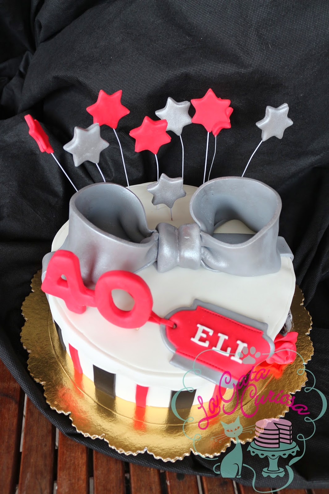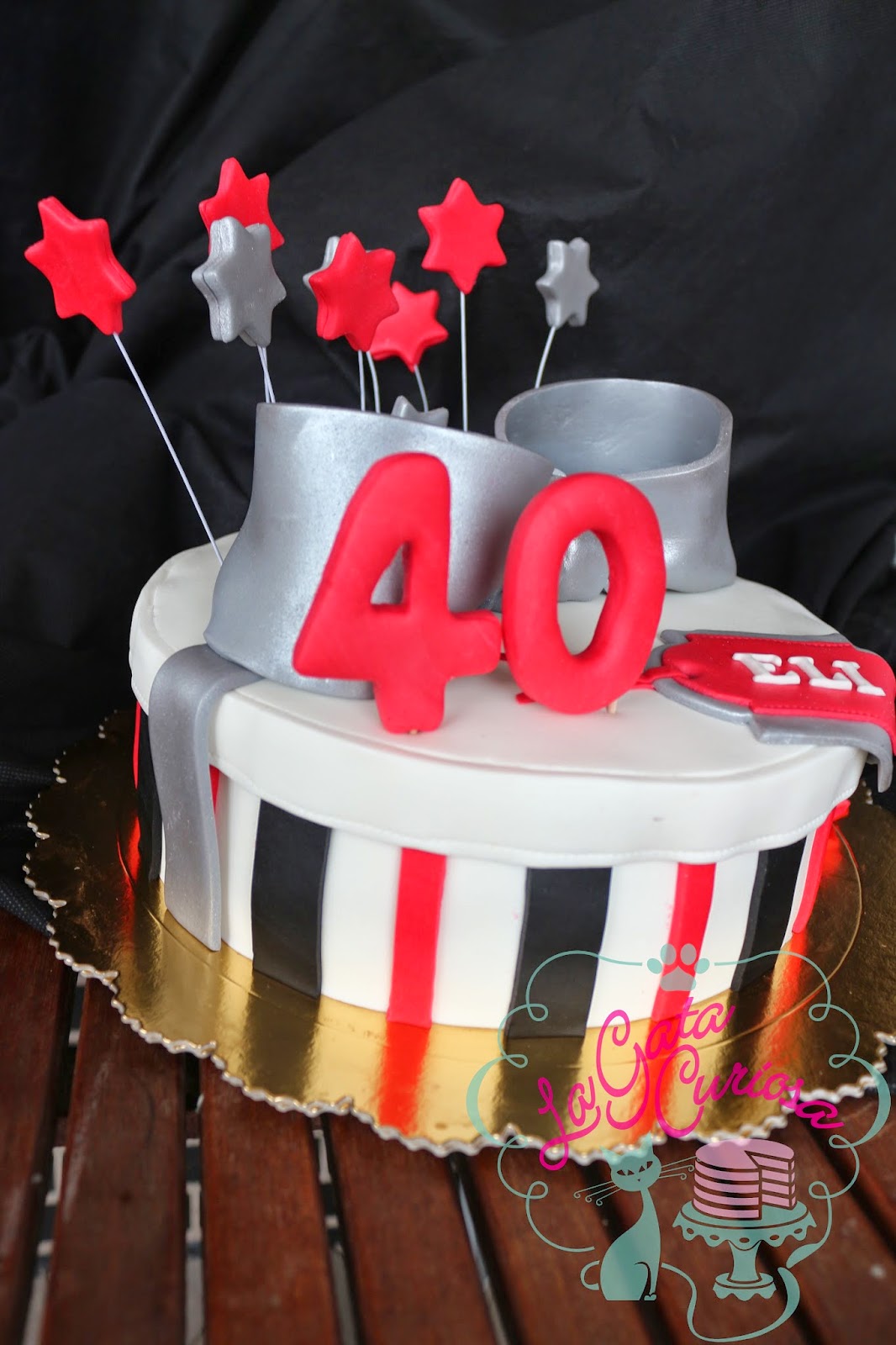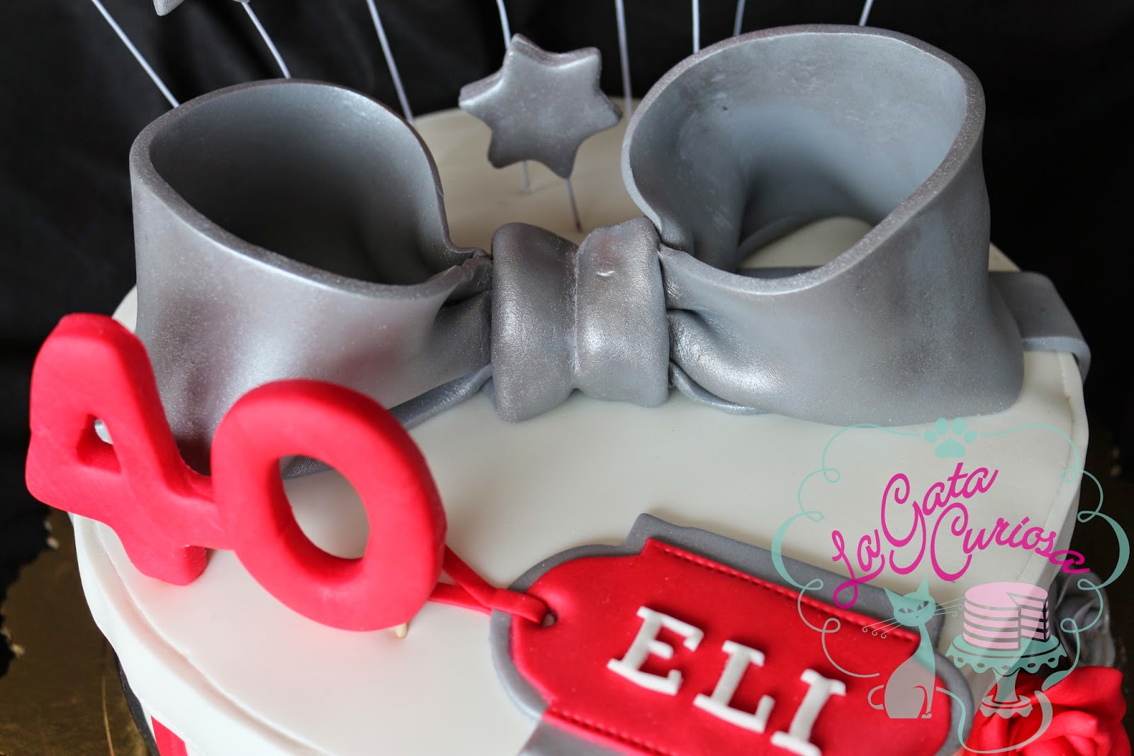 Elisa cumplió 40 años el sábado pasado y sus amigas nos encargaron una tarta con forma de regalo para celebrarlo, los colores elegidos fueron el blanco, el negro y el rojo, complementados con plateado.