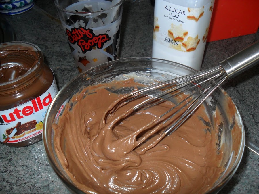 Preparamos la buttercream de nutella que es muy fácil y resultona ademas su sabor es espectacular A los 125 gr. de mantequilla vamos añadiendo el azúcar glass poco a poco y removiendo bien con unas varillas, hasta completar los 125 gr. de azúcar glass, una vez bien integrada el azúcar glass con la mantequilla añadimos las tres cucharadas bien colmadas de nuetlla y seguimos removiendo hasta que os quede una pasta homogénea que mmmm como estáis tentados a meter un dedo os aseguro que
