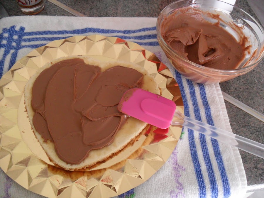 Bien cortáis el bizcocho, yo lo he cortado en tres capas, ponéis una capa de bizcocho, con un pincel lo mojáis de almíbar y el relleno encima, luego de nuevo la misma operación, bizcocho almíbar , relleno y encima de la buttercream puse un poquito de mermelada de fresa, y tapais con la ultima capa de bizcocho.Una vez montada la tarta la he recubierto tanto por encima como por los lados de una fina capa de buttercream y la metemos en la nevera mientras preparamos el fondant.