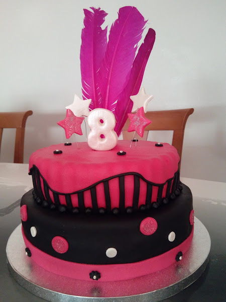 Asi que surgio la tarta que veis en la foto...el bizcocho fue de yoghurt y relleno de buttercream de chocolate. El fondant de abajo de regaliz ( color negro). De dos pisos: el de abajo cubierto de fondant negro una cinta fucsia y unas florecillas negras con perlas plateadas. Por toda la base decorada con circulos fucsias y plateados. El piso de arriba forrado con fondant fucsia y todo el lateral decorado con lineas de fondant negro. La cima de la tarta decorado como especie de un mantel color fucsia bordeado con una linea fina de color negro.