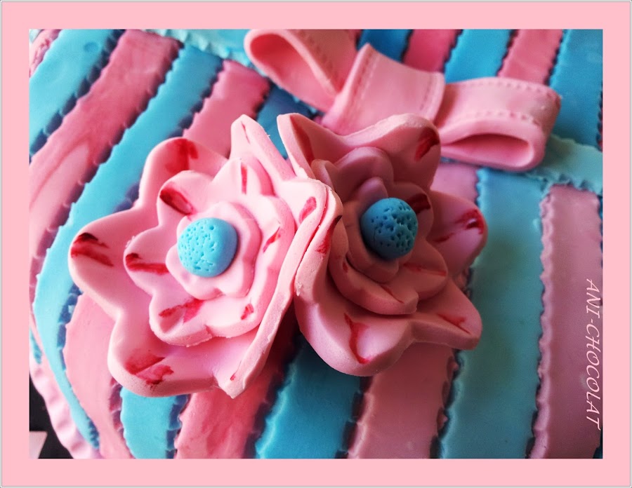 Precalentamos el horno con ventilador 180º. En un bol batimos bien el azúcar con los huevos hasta que todo esté bien integrado, dejamos de batir y echamos el yogurt natural, seguimos batiendo, dejamos de batir para incorporar el vaso de aceite, seguimos batiendo (a velocidad lenta) y añadimos poco a poco la harina tamizada junto con el sobre de levadura. Vertemos la masa en el molde previamente engrasado con mantequilla y harina tamizada. Lo tendremos unos 35 minutos aprox. como siempre, comprobamos con un palillo para ver que no mancha. Lo dejemos enfriar sobre una rejilla. Con unas varillas mezclamos el queso con el azúcar glass (lo echamos poco a poco), a continuación echamos la vainilla y por último el cacao, verás como obtienes una crema apta para rellenar y cubrir la tarta. Reservamos un par de trozos de fondant blanco para teñirlos. Estiramos con un rodillo el resto de fondant y cubrimos nuestra tarta, teñimos los trozos de fondant de rosa y azul y recortamos tiras, con un pincel mojado en agua pincelamos la tarta y vamos pegando los trozos. Para hacer las flores necesitas un corta pastas con esta forma. A comer!!