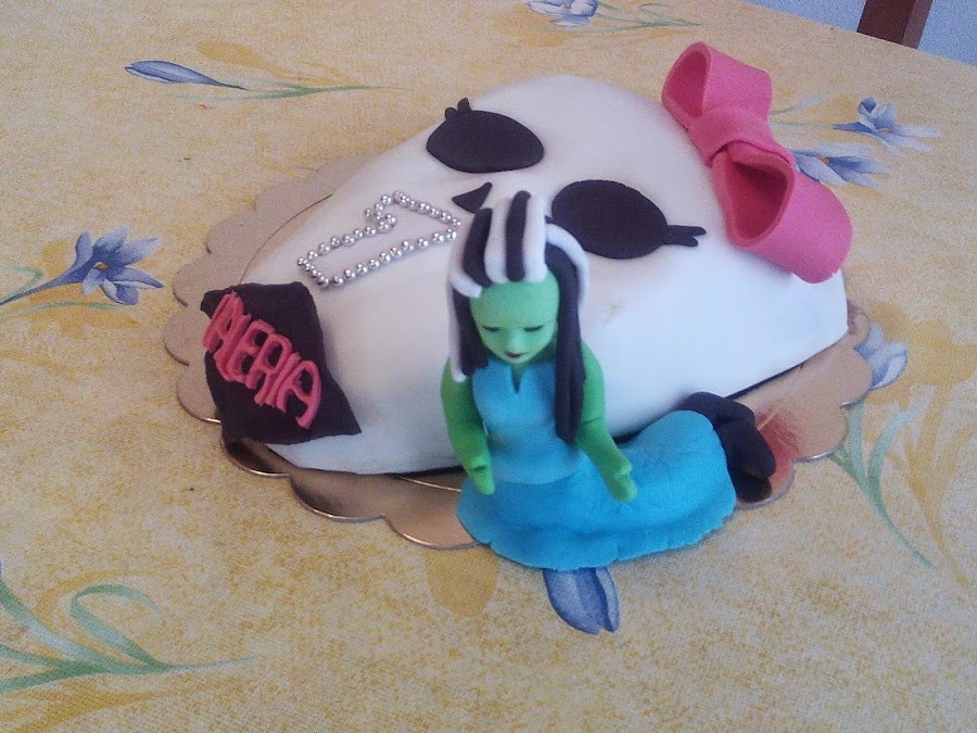 Bueno aqui os dejo otra tarta mas, esta para mi sobrina Valeria que este año tambien me pidio que se la hiciera de las Monsters High. El bizcocho de yogurth de chocolate y relleno de chocolate ( le gusta mucho el chocolate!!!!!). Este año se me ocurrio hacerla con forma de calabera ya que es el simbolo de estas muñecas, con el lazo rosa y un intento ( no muy acertado) de modelar la franqui que es la que le gusta. Seguiremos practicando esta parte que no se me da muy bien jejeje, ademas ha quedado" de miedo" jajajaja.