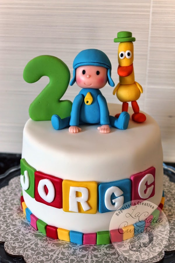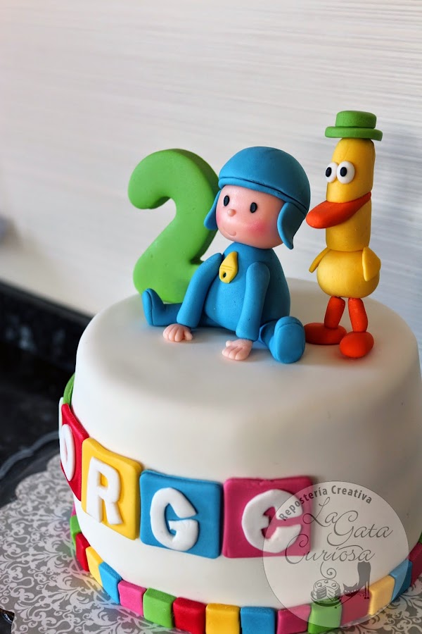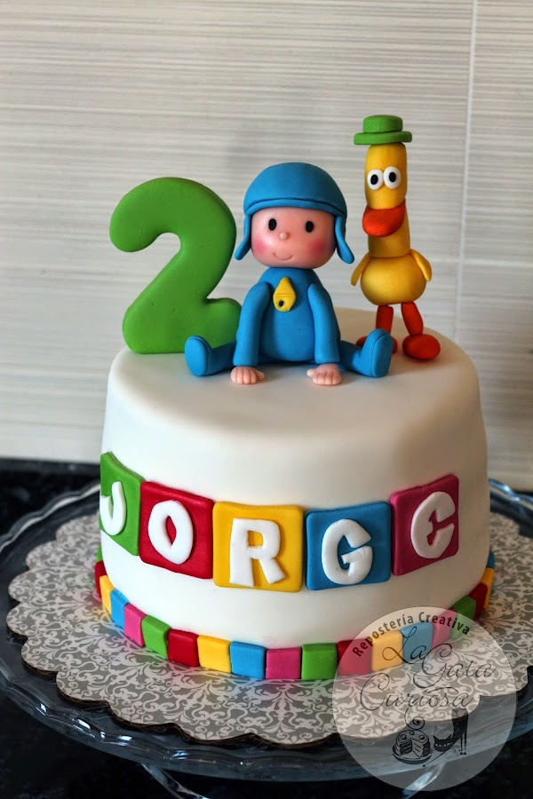El exterior salta a la vista, Pocoyó con su amigo el pato (tiene nombre?.... un momento que los busco en internet), Pato se llama el amigo de Pocoyó y el número de años que cumple Jorge. Por dentro bizcocho de chocolate, almíbar de vainilla, mermelada de fresa acompañada de chocolate blanco
