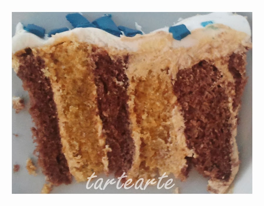El cuerpo es la tarta. Lleva dos bizcochos intercalados uno de chocolate y otro de toffe, calado con almíbar de toffe y relleno de buttercream de dulce de leche. Aquí podéis ver el corte. Estaba muy rico y jugoso.
