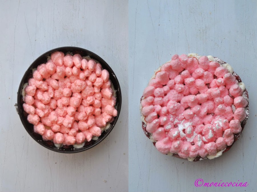 Colocamos el otro bizcocho, empapamos con cointreau y montamos las claras con un poco de azúcar y coloreamos con unas gotitas de colorante rojo.