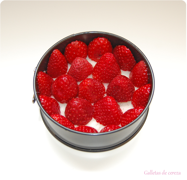 Vertemos sobre la base con fresón y guardamos en la nevera hasta que haya cuajado.