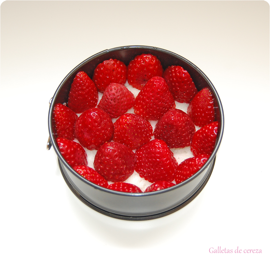 A continuación partimos algunos fresones por la mitad y los colocamos encima del bizcocho, con la parte cortada hacia el aro. Colocamos más fresones, esta vez enteros, con la punta hacia arriba llenando todo el hueco y hundiéndolos bien en el bizcocho.
