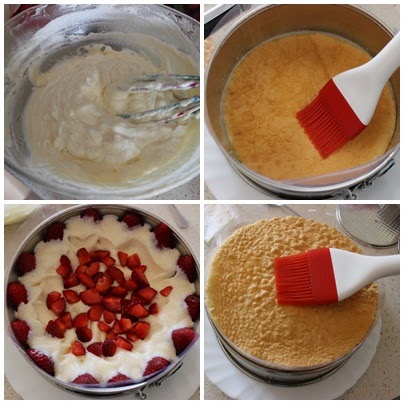 ponemos un poco de crema encima del bizcocho y la repartimos uniformemente. Partimos las fresas por la mitad (sin el rabito verde y las colocamos a lo largo de todo el circulo con la parte cortada pegando al circulo, presionamos bien para que queden sujetas a la crema. Rellenamos con crema los huecos que quedan entre las fresas y ponemos las fresas cortadas en cuadritos en el centro de la tarta. Rellenamos con el resto de crema. Ponemos el otro circulo de bizcocho encima y lo emborrachamos con almíbar con un pincel. Ver las fotos de arriba.
