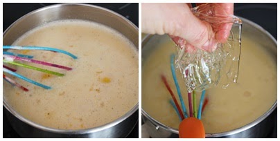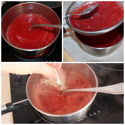 Las ponemos en un cazo con el agua y el azúcar, dejamos cocer unos minutos , sacamos del fuego y la colamos con un colador para quitarle los granitos, si le queda algunos. La calentamos un poco si se ha enfriado y añadimos la gelatina escurrida. Mezclamos hasta que se disuelva toda y dejamos que se temple.