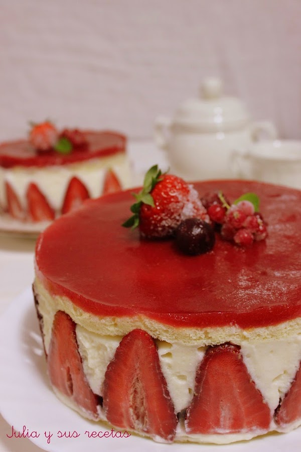 La Tarta Fraisier es un clásico dentro de la repostería francesa. El origen del nombre deriva de la palabra fraisier, fresa, en francés. Se trata de una tarta hecha con dos capas de bizcocho genovés remojado en almíbar de aguardiente de cerezas , fresas y crema diplomática. Suele terminarse con una capa de mazapán o merengue italiano dependiendo de la variante que hagamos. Yo he preferido ponerle una capa de gelatina de fresas naturales.